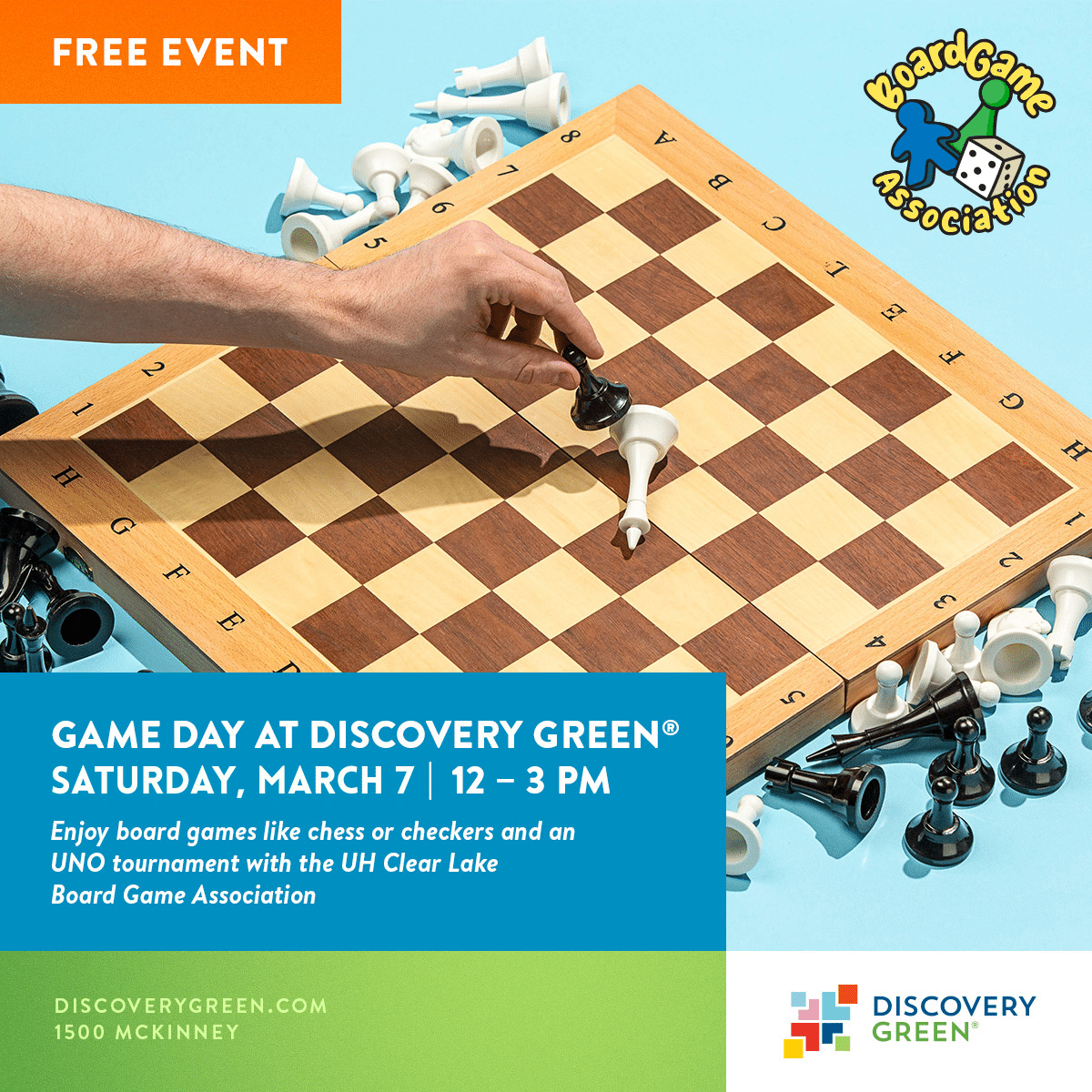 Bring a friend or make a new one at Discovery Green’s Game Day. Enjoy board games like chess or checkers and an UNO tournament with the UH Clear Lake Board Game Association.